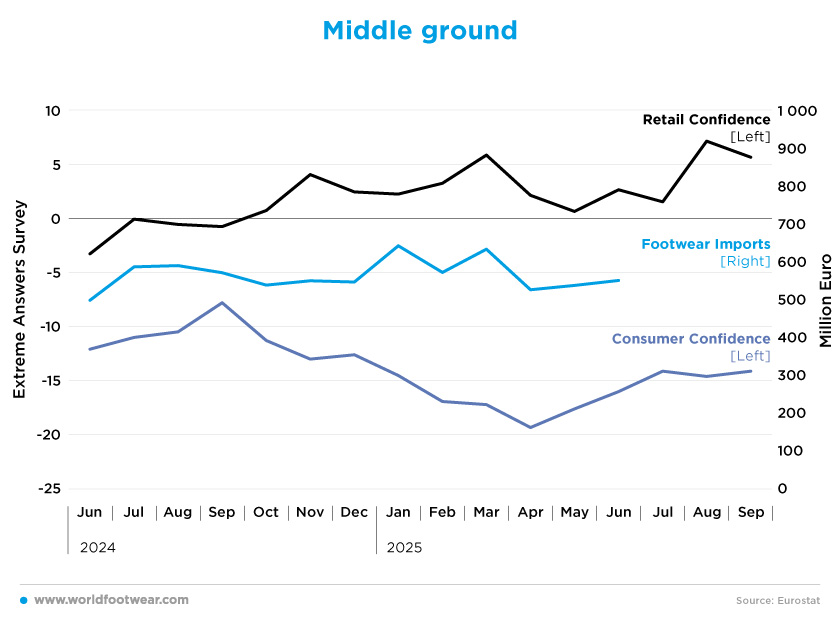During the first half of 2025, the Netherlands imported 216.9 million pairs of shoes, worth 3.5 billion euros in total. This equated to an average price of 15.94 euros per pair. These figures represented a 17.9% increase in import volume and a 12% increase in value.These double-digit increases represent a middle ground between retail and consumer confidence. Following the slumps recorded in May, retail confidence surged by 833% (from 0.6 to 5.6 points on the EAS), while consumer confidence increased by 25% (from minus 17.6 to minus 14.1). Although consumer confidence remains negative, it is now back above the levels seen in January.