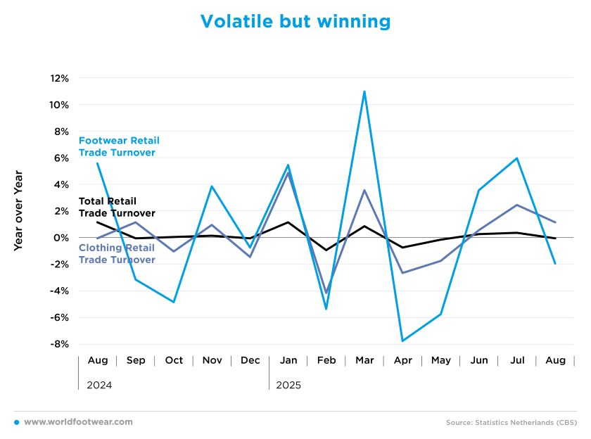 The Dutch footwear retail sector has held up against volatility, achieving a 0.7% increase in sales in the first eight months of 2025, as compared to the same period of the previous year. This outpaces growth in the overall retail market. Despite highly variable monthly sales, ranging from a high of 11% to a low of 7.7%, this modest growth trajectory appears to be supported by a surge in retail confidence, which aligns with positive import data. Although still negative, consumer sentiment is slightly more optimistic