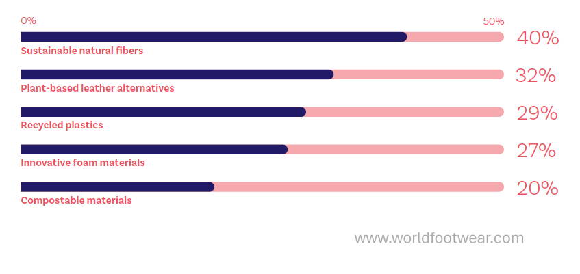 Survey results indicate that sustainable natural fibres will be the dominant footwear material trend over the next two years, receiving 39.6% of responses.