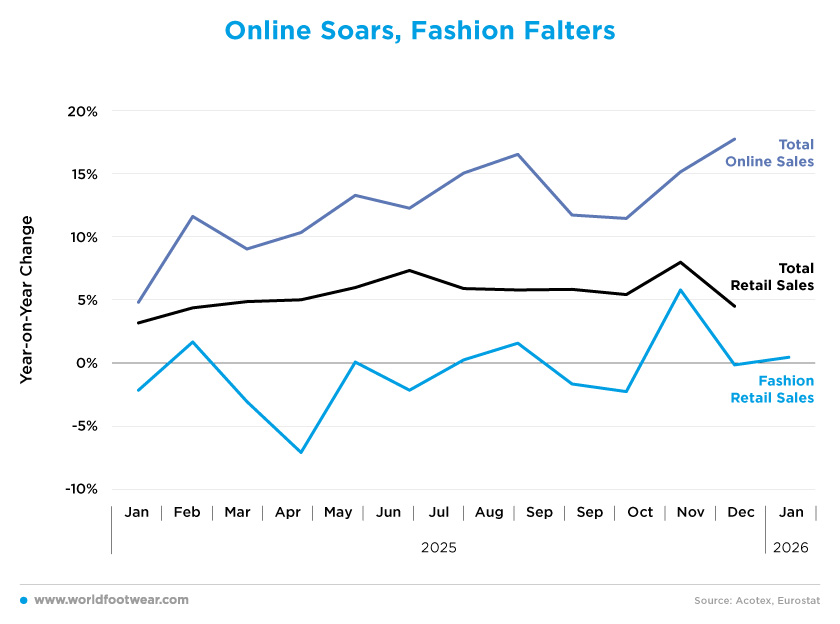 The start of 2026 has remained subdued, with fashion sales increasing by just 0.4% in January – well below industry expectations. According to Acotex, consumers are allocating a greater share of their disposable income to services such as travel, dining out, and leisure activities, rather than buying clothing (revistadelcalzado.com).