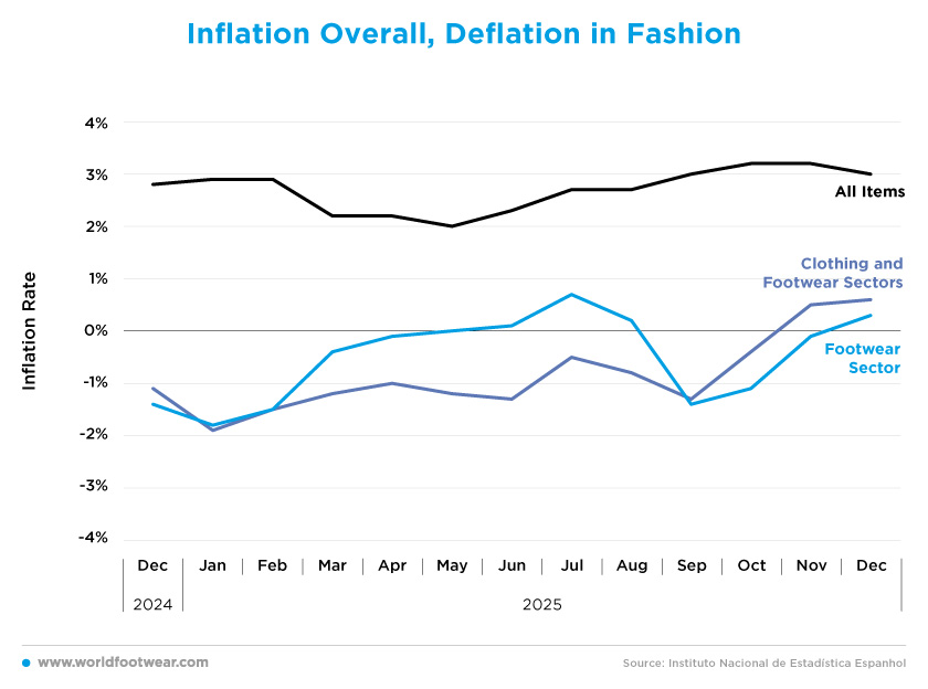 While Spain’s average inflation rate stood at 2.7% in 2025, the fashion sector experienced a clear deflationary trend. Over the course of the year clothing and footwear prices declined by 0.8%, while footwear alone fell by 0.4%. This contrasts sharply with the evolution of the overall consumer price index, resulting in a 2.9 percentage point gap relative to headline inflation. The data suggest that it remains difficult to pass on costs increases to final consumers (modaes.com).This divergence intensified at the start of 2026. In January, fashion prices fell by 13.1% month-on-month, marking the steepest January decline since the pandemic and the largest monthly drop among all components of the CPI basket. On a year-on-year basis, fashion prices decreased by 1.9% in January 2026, while headline inflation remained positive at 2.3% (moades.com).