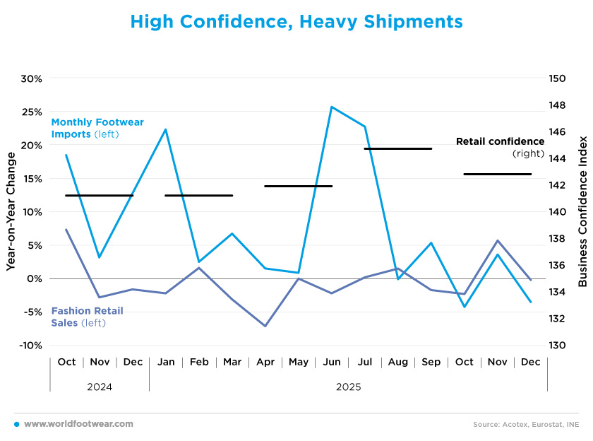 The Spanish economy concluded 2025 with an estimated growth of 2.8%, significantly outperforming its major European counterparts (reuters.com). However, this broader macroeconomic strength did not translate into the fashion sector, where retail sales recorded an average monthly year-on-year decline of 0.8% compared with 2024.The year ended with a disappointing Christmas campaign, falling short of expectations. The trade association Acotex noted that “the sector still hasn’t managed to recover sales in a consistent way,” describing 2025 as a complicated year (revistadelcalzado.com). In December alone, sales contracted by 0.2% year-on-year.