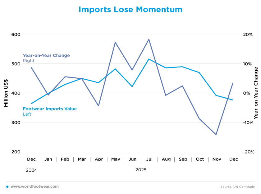Footwear imports into the UK showed significant volatility throughout 2025, closely reflecting fluctuations in retail performance.Following a modest year-on-year decline of 0.7% in January 2025, imports recovered in subsequent months, with steady growth in February and March. However, this momentum was interrupted in April, when imports fell by 4.3%. They then rebounded strongly in May with a 17.3% increase.